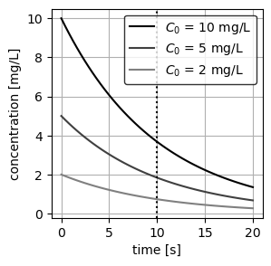 C0 = [ 10, 5, 2] # initial concentrations (mg/L)